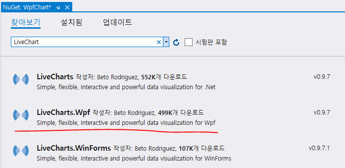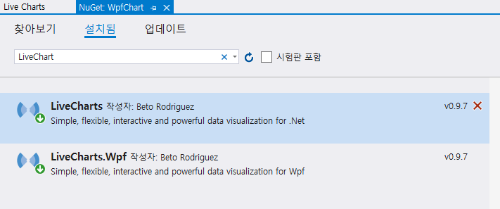 1. NuGet에서 LiveChart를 설치합니다.