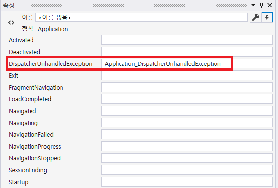 - App.xaml에 DispatcherUnhandledException 이벤트를 추가하면 App.xaml.cs에 Application_DispatcherUnhandledException가 추가됩니다.