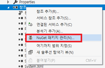 (1) 프로젝트 참조의 팝업 메뉴 NuGet 패키지 관리를 클릭합니다.