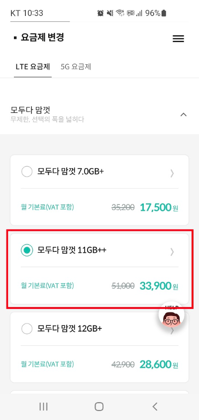 자신이 원하는 요금제를 선택 후 요금제를 변경하면 됩니다.