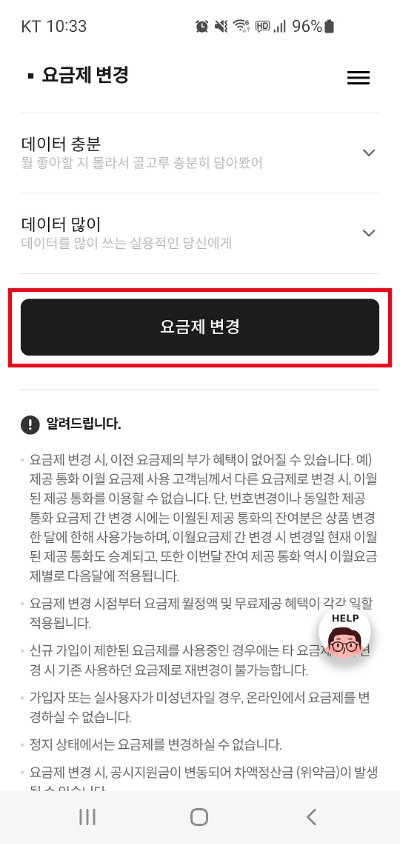 마지막으로 확인을 탭 하시면 요금제가 변경됩니다.