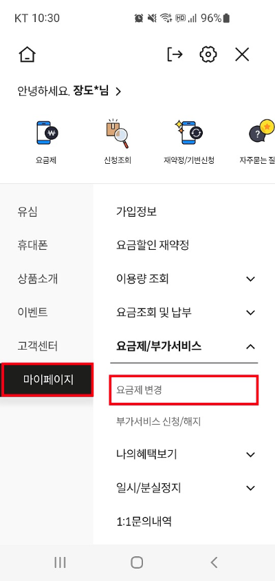마이페이지 > 요금제/부사서비스 > 요금제변경