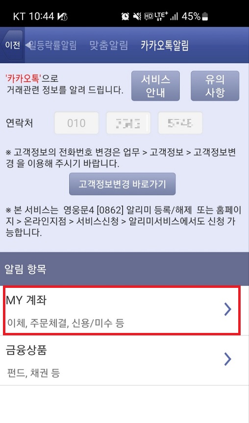 카카오톡알림 화면에서 MY 계좌를 탭합니다.