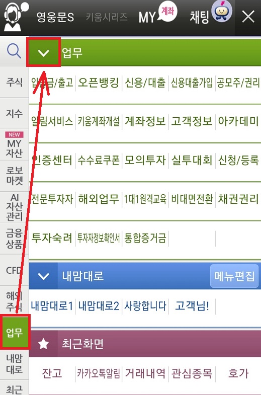 좌측 메뉴들 중에 업무에서 "∨" 아이콘을 탭합니다.