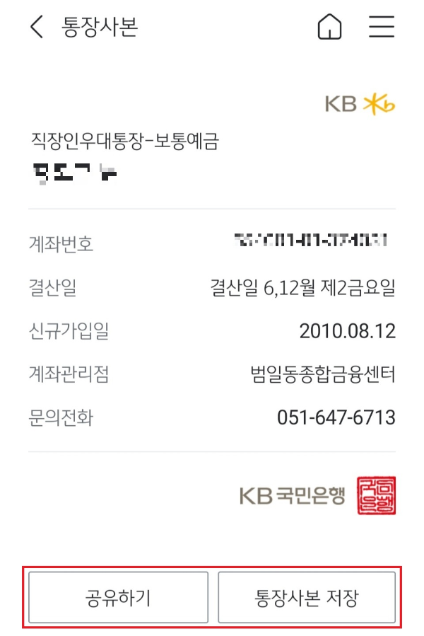 공유하기 : 문자 또는 카톡 등으로 통장사본을 공유 할 수 있습니다.