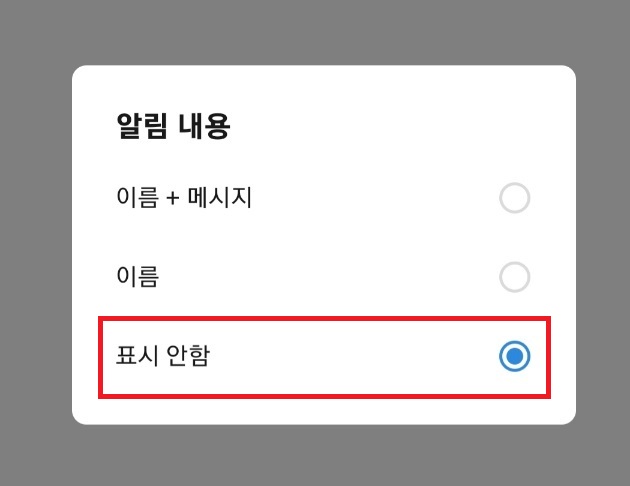 알림 내용에서 표시 안함을 설정합니다.
