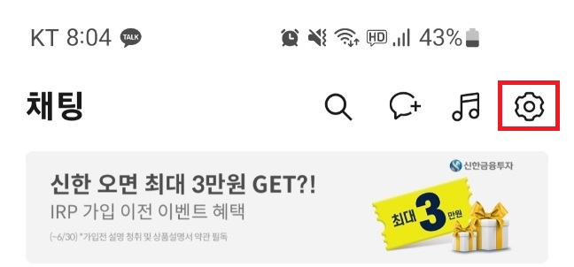 카톡 채팅화면에서 오른쪽 상단의 설정 아이콘을 탭합니다.
