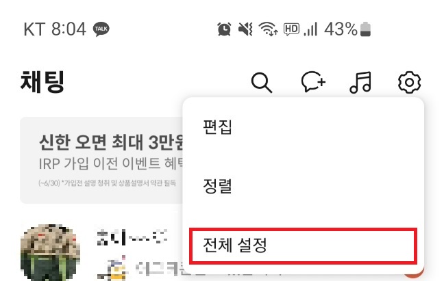 전체 설정 메뉴를 탭합니다.