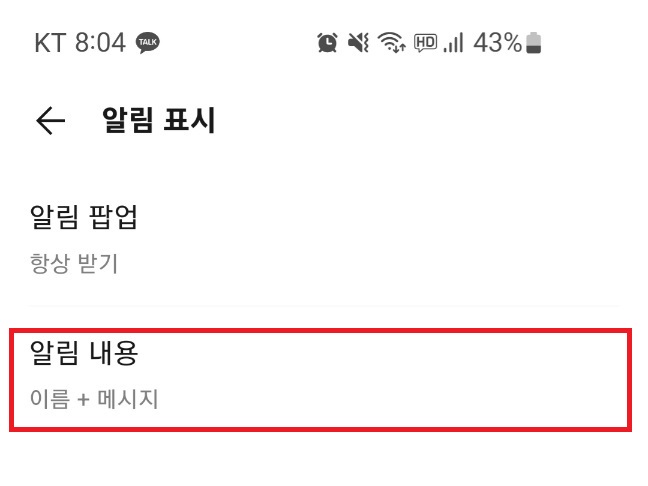 카톡의 알림은 받지만 내용을 알림을 받을 때 표시하지 않도록 설정하면 안심이겠죠.