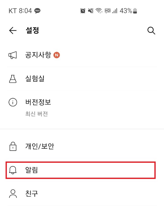 설정화면에서 알림 메뉴를 탭합니다.