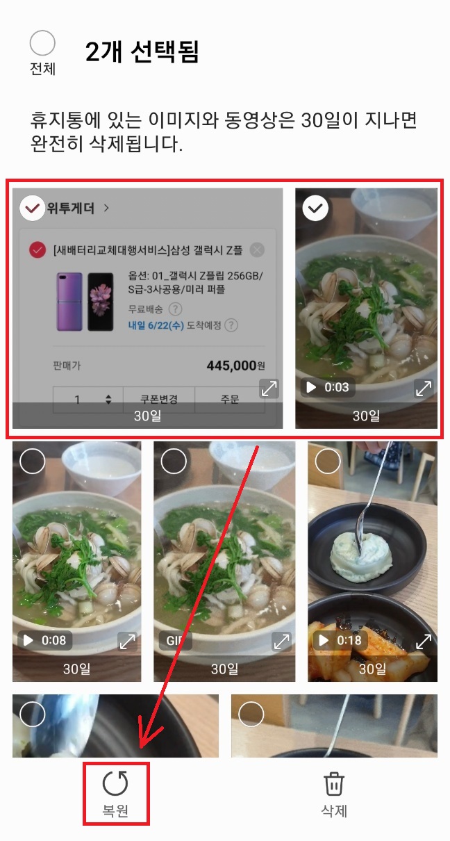 휴지통 화면에서 복원 할 사진을 길게 탭합니다.