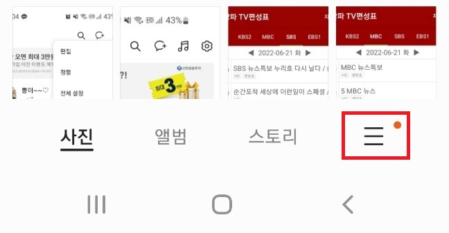 갤러리 앱을 실행하고, 화면 하단의 오른쪽 메뉴를 탭합니다.