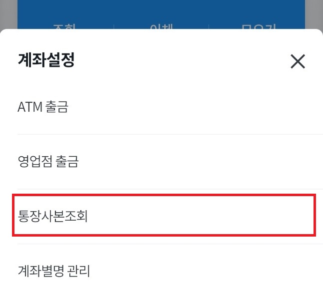 하단에서 여러 메뉴가 표시되는데, 통장사본조회 메뉴를 탭합니다.