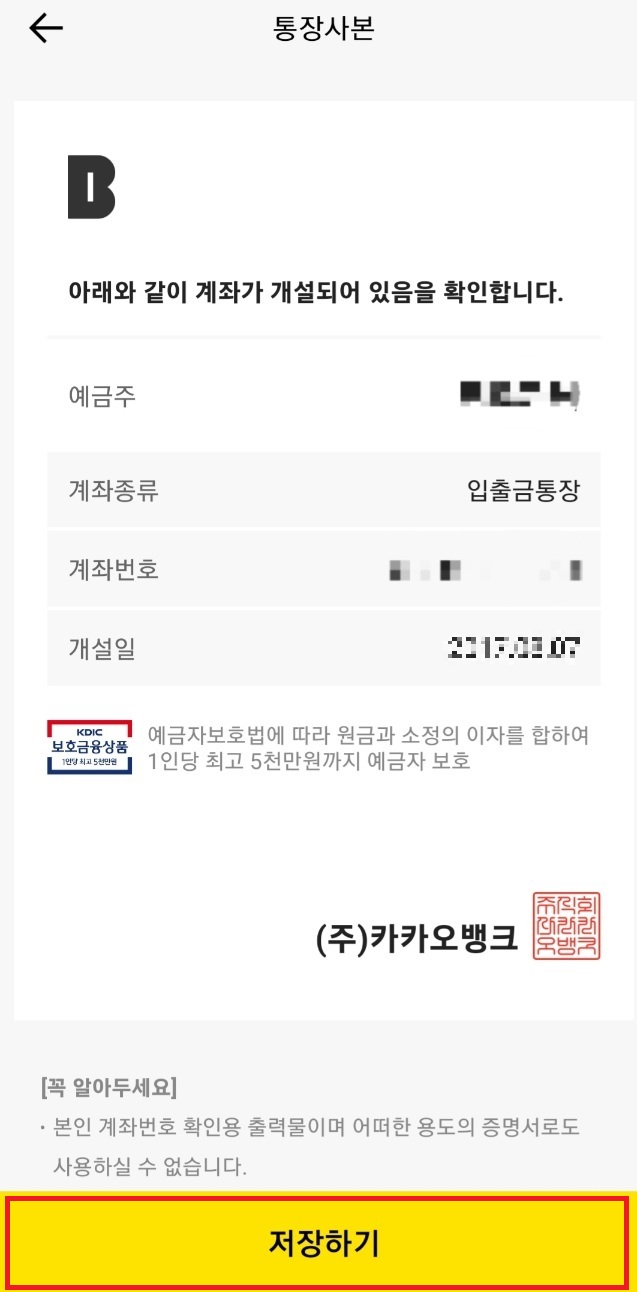 (갤러리의 Kakaobank 앨범에 통장사본 이미지를 찾을 수 있습니다.)