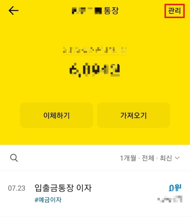 통장화면의 우측 상단의 관리 메뉴를 탭합니다.