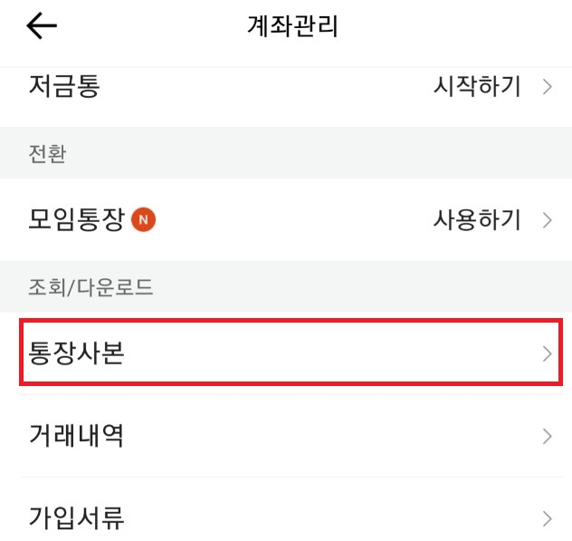 계좌관리 화면에서 통장사본을 탭합니다.