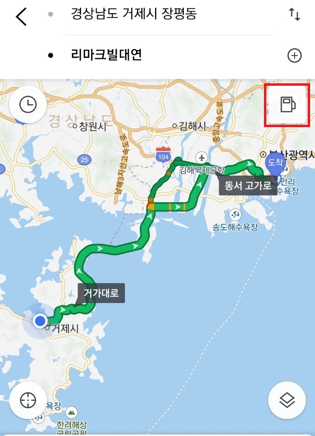 지도에 경로가 표시되는데, 우측 상단에 주유소 아이콘을 탭합니다.